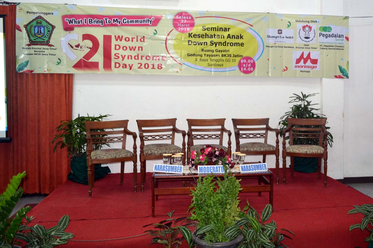 Dalam rangka rangkaian World Down Syndrome Day 2018, BKKKS Provinsi Jawa Timur bekerjasama dengan YKAI Provinsi Jawa Timur, PT. Pegadaian (Persero), Shangri-La Hotel Surabaya dan Morinaga telah menyelenggarakan kegiatan Seminar Kesehatan Anak Down Syndrome. Kegiatan tersebut dilaksanakan pada hari Selasa, 27 Maret 2018  jam 09.00 – 14.00 wib di ruang Gayatri Gedung Yayasan BK3S Jawa Timur, Jl. Raya Tenggilis GG 10 surabaya. Peserta dalam kegiatan tersebut berjumlah 100 an peserta dari beberapa komunitas, perorangan, organisasi sosial di daerah surabaya, Gresik dan sekitarnya.