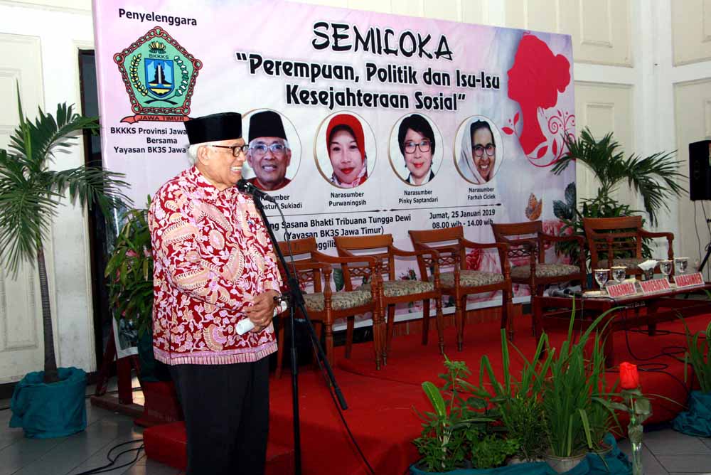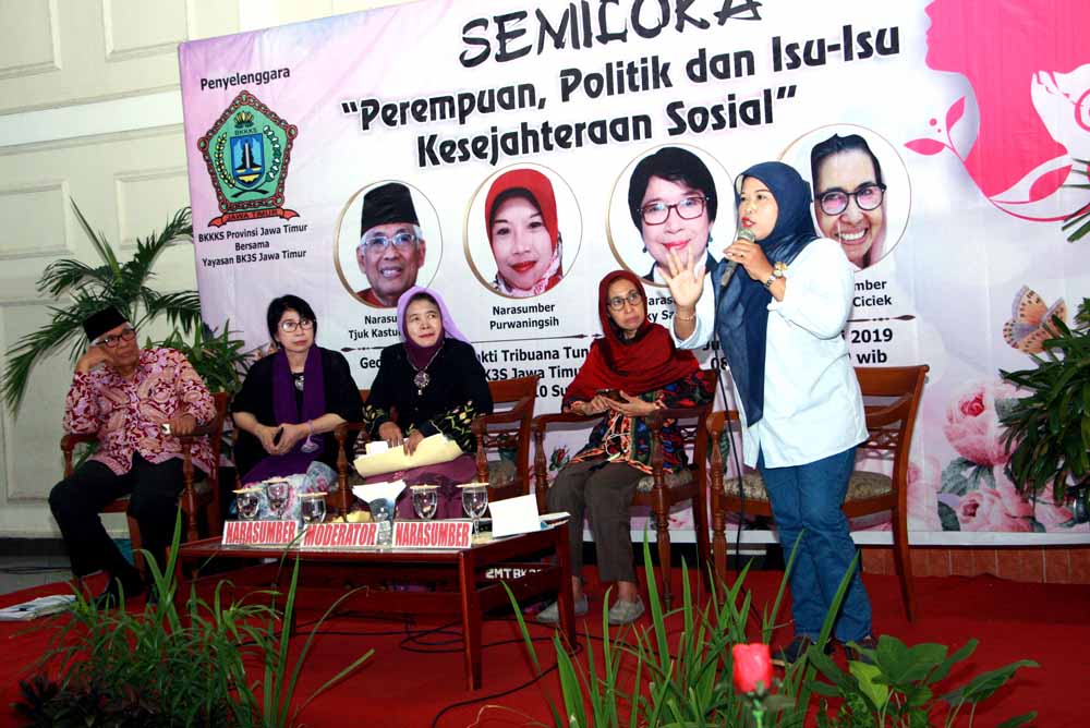Badan Koordinasi Kegiatan Kesejahteraan Sosial (BKKKS) Provinsi Jawa Timur bersama Yayasan Badan Kerjasama Kegiatan Kesejahteraan Sosial (BK3S) Jawa Timur telah menyelenggarakan Semiloka “Perempuan, Politik dan Isu-Isu Kesejahteraan Sosial” pada hari Jumat, 25 Januari 2019 di Gedung Yayasan BK3S Jawa Timur, Jl. Raya Tenggilis GG 10 Surabaya.