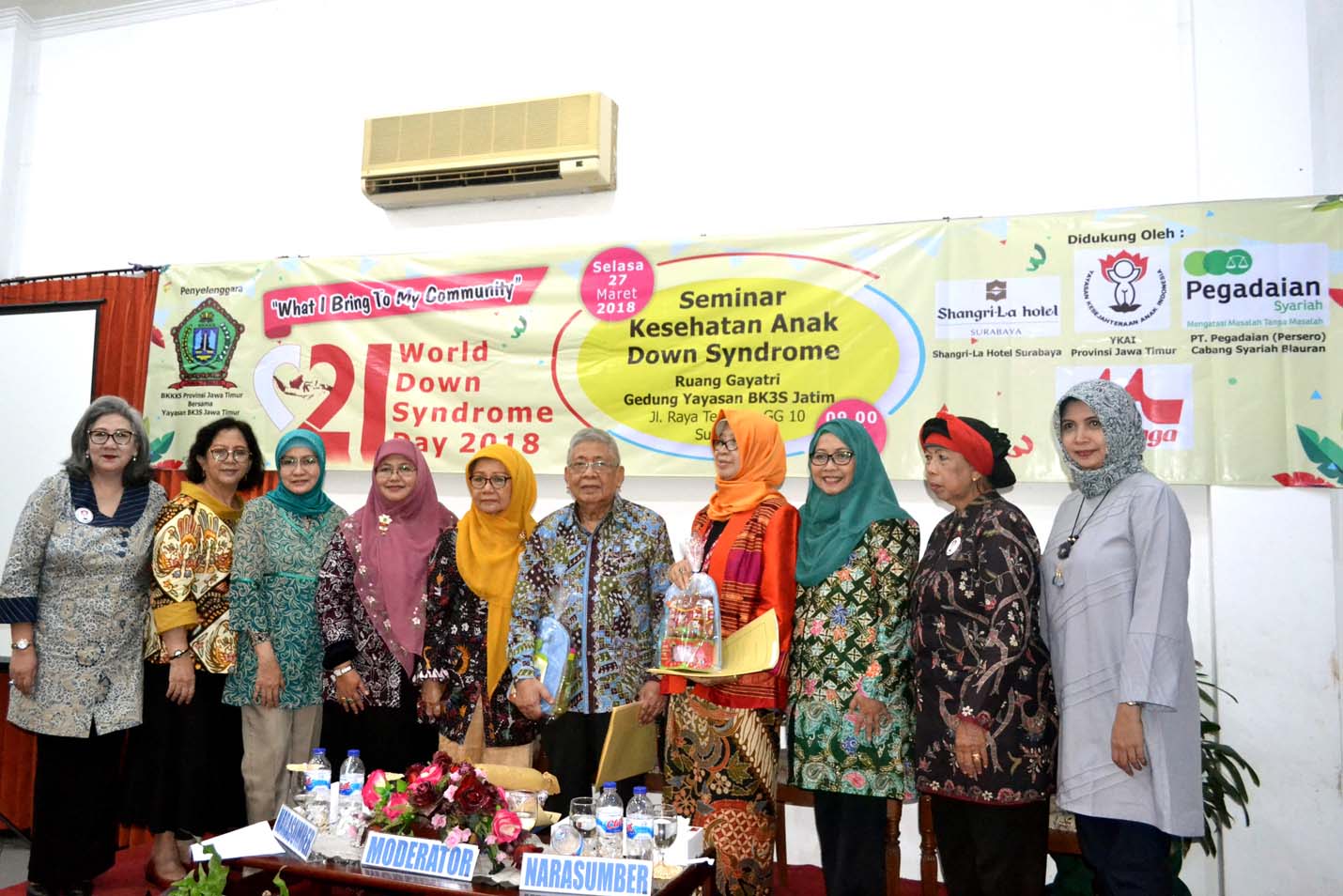 Dalam rangka rangkaian World Down Syndrome Day 2018, BKKKS Provinsi Jawa Timur bekerjasama dengan YKAI Provinsi Jawa Timur, PT. Pegadaian (Persero), Shangri-La Hotel Surabaya dan Morinaga telah menyelenggarakan kegiatan Seminar Kesehatan Anak Down Syndrome. Kegiatan tersebut dilaksanakan pada hari Selasa, 27 Maret 2018 jam 09.00 – 14.00 wib di ruang Gayatri Gedung Yayasan BK3S Jawa Timur, Jl. Raya Tenggilis GG 10 surabaya. Peserta dalam kegiatan tersebut berjumlah 100 an peserta dari beberapa komunitas, perorangan, organisasi sosial di daerah surabaya, Gresik dan sekitarnya.